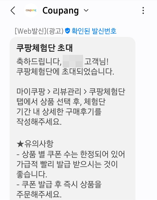 어차피 우리는 살아가는 동안 많은 물건을 구입하고 있습니다. 지금까지 오프라인을 포함한 다양한 곳에서 구입하셨다면, 이제 쿠팡에서 좀 더 자주 구매하신 후 사용후기를 차곡차곡 쓰시면 됩니다. 후기는 내가 구매한 제품만 쓸 수 있으니까요. 그러면 어느 날 <쿠팡 체험단에 초대되었습니다>라는 문자를 여러분들도 받을 수 있습니다.