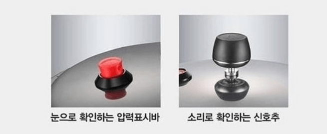 또한 소리로 확인하는 신호추 뿐만 아니라 눈으로도 확인할 수 있는 압력표시바가 있습니다. 뚜껑에 있는 압력표시바와 신호추를 통해서 내부의 압력 유무를 확인할 수 있습니다.
